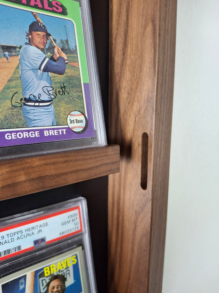 The grooves in all of our shelves have our unique angled back edge. This allows any card from 1/16" thick (toploader sleeve) to 3/8" thick (magnetic one touch holders) to slide downward to the inside of the front edge. This design forces all the cards to rest in the same plane, making the entire display more attractive.